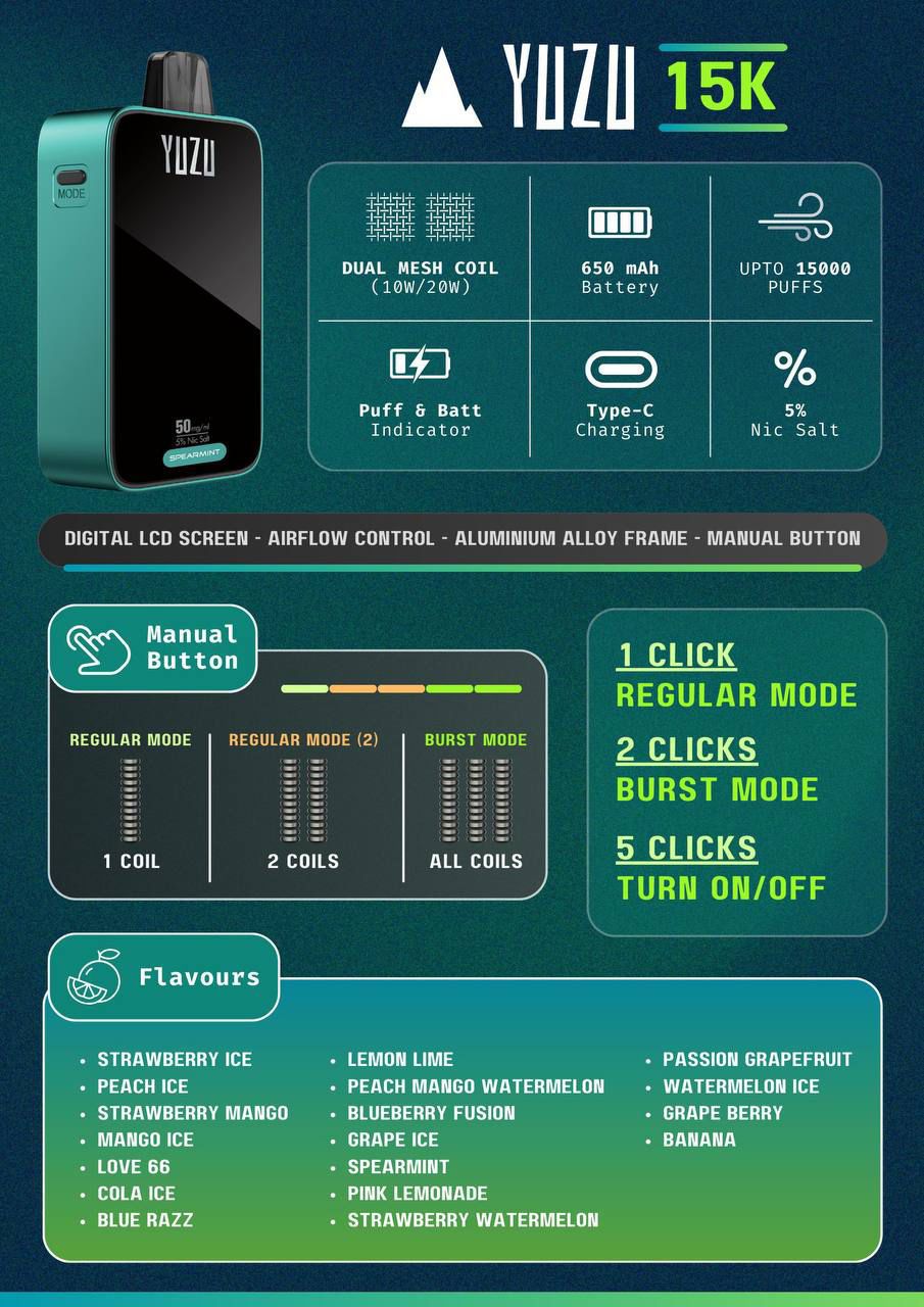 Why Choose the Vuzu 15000 Puff Disposable Vape:With extraordinary 15,000 puffs capacity, the Vuzu 15000 Puff Disposable Vape is unmatched in terms of durability and worth. It has an elegant portable design that makes it a good companion when you are travelling; it also has advanced flow control technology which makes inhalation smoother and enjoyable. The e-liquid contained within it has a powerful and consistent taste that is difficult to resist. This type of disposable pen is perfect for all types of vapers as it has no need for replenishing nor maintenance thus making your life completely carefree.